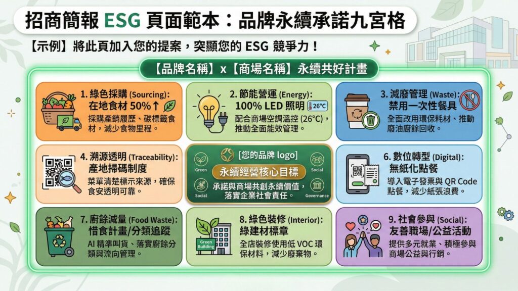 - 加分項: 具體的廚餘減量計畫(如剩食捐贈、精準備料 SOP),這對商場的垃圾處理成本有直接幫助。