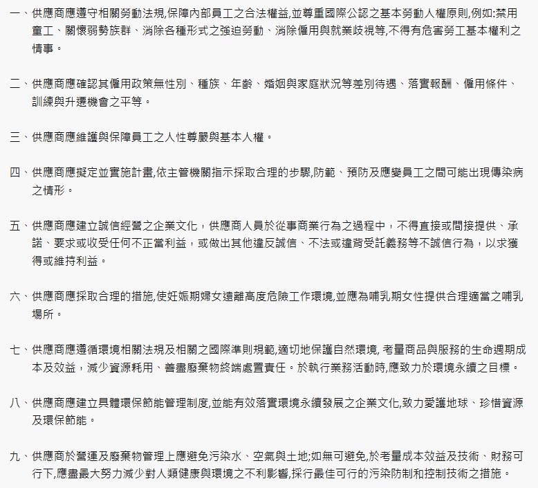 例如遠東百貨就在官網寫下永續管理準則,在合約中明定「永續條款」,目前簽署涵蓋率已達 98% 以上。